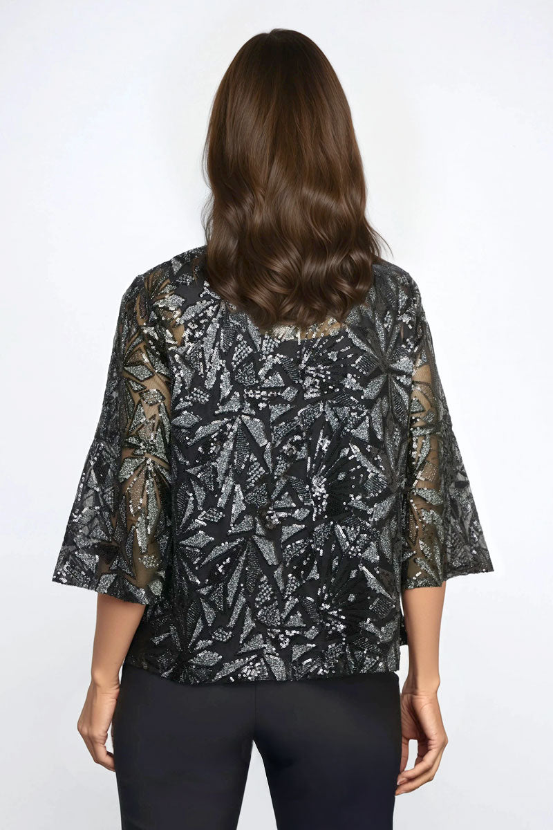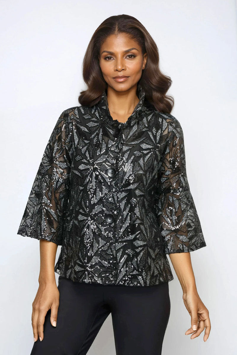It's the time to shine! Perfect for any party, the Geo Sequins Jacket is encrusted with a geometric pattern of jet sequins on mesh, guaranteed to bring out your inner glow. This adjustable collar, button down jacket features an a line silhouette that flows over the body with relaxed ease.