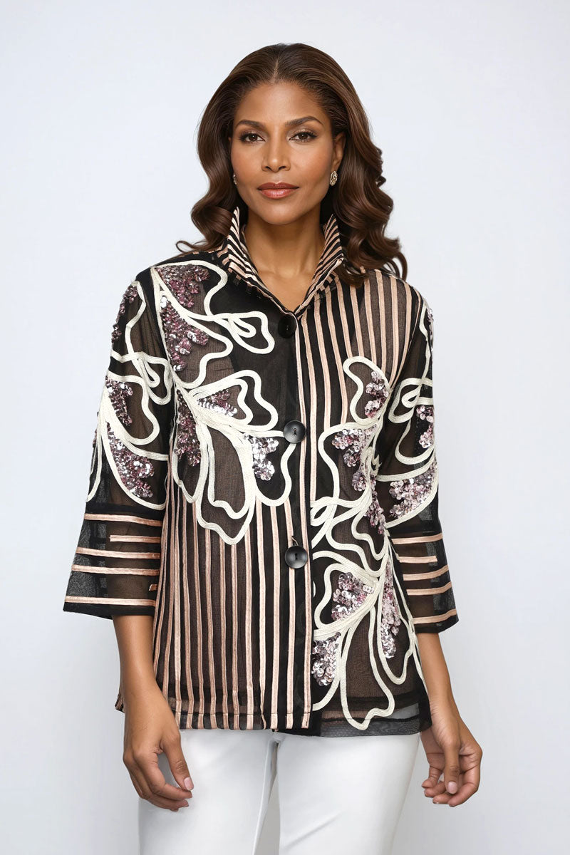 Soutache is back!  This Frederique jacket is a lightweight topper that fits like a dream with sparkle to spare.  The clever placement of black mesh and with white and rose ribbon creates an abstract floral & line pattern with movement and flow.  Carefully placed sequins add dressed-up flair.  It's a great choice for an occasion that calls for a little something special.