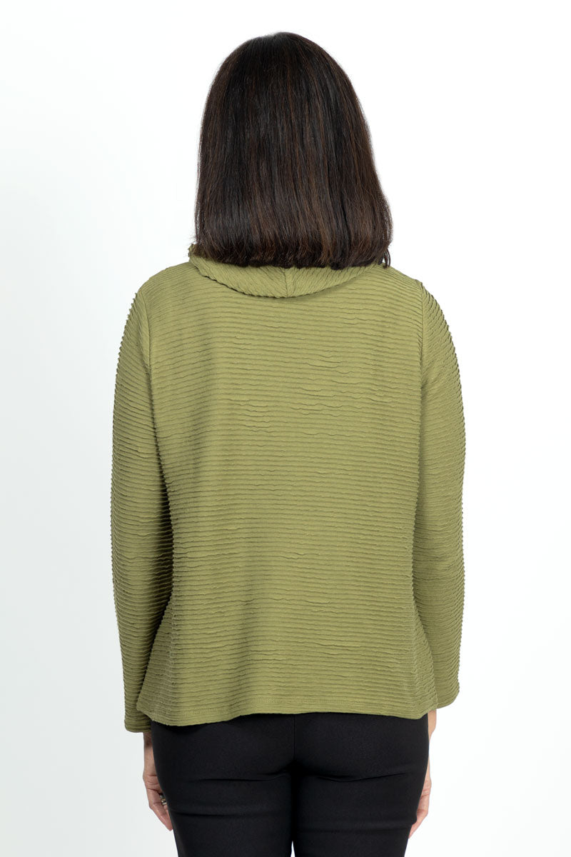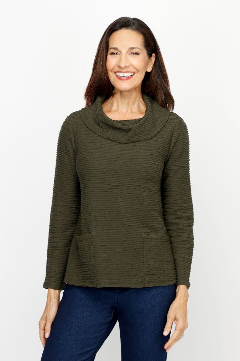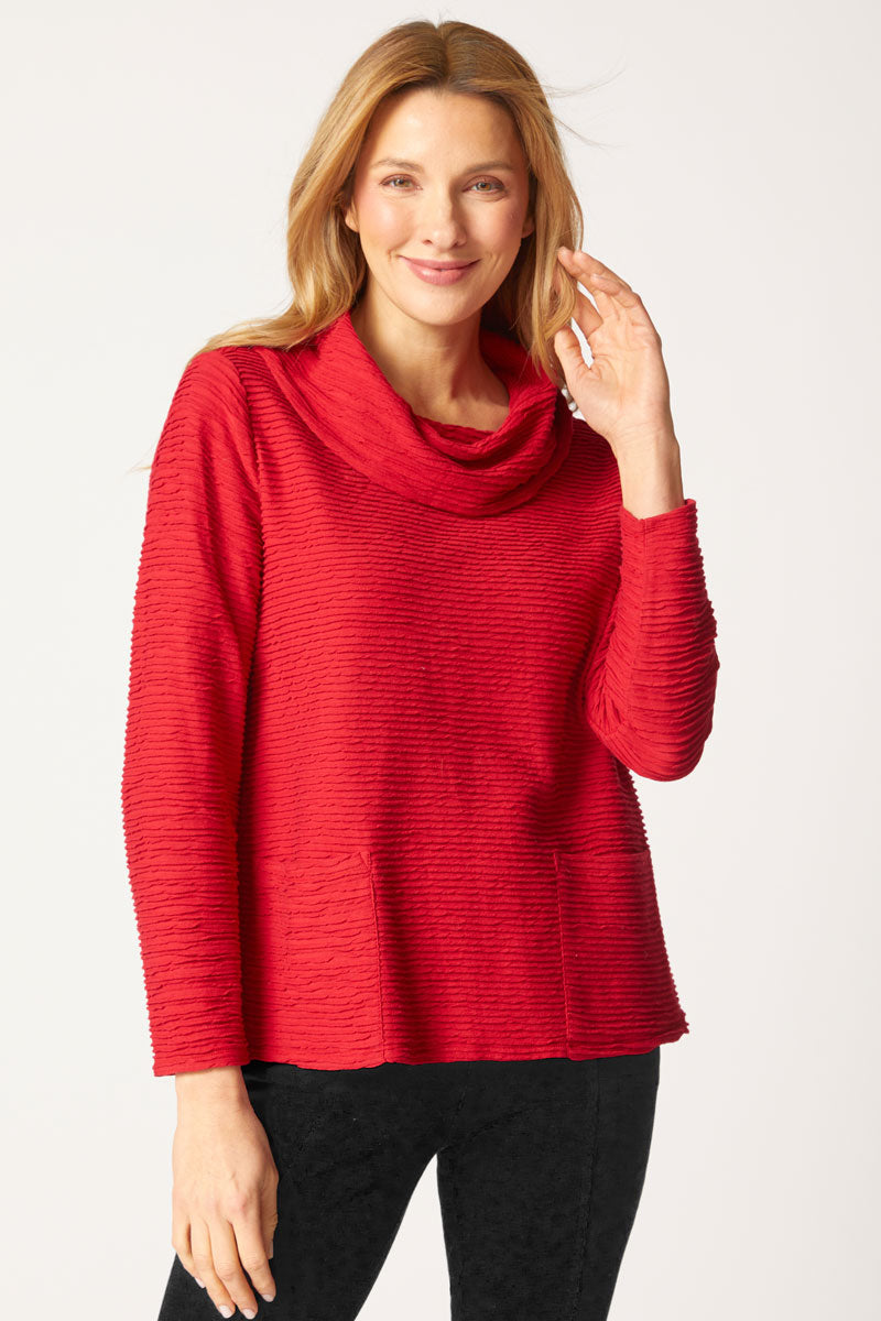 Cozy up in the super soft and stretchy Ripple Cowl Neck Top. This textured woven top a simple a-line silhouette and a relaxed fit.