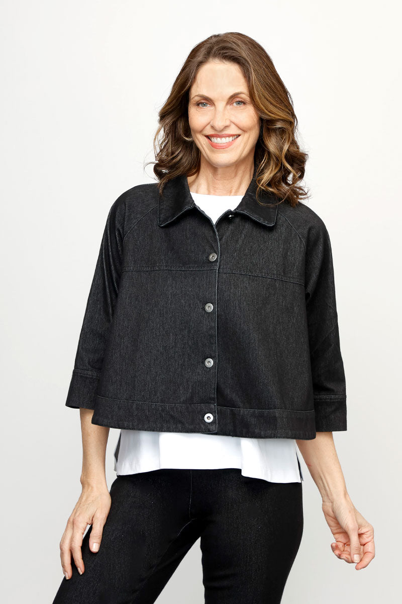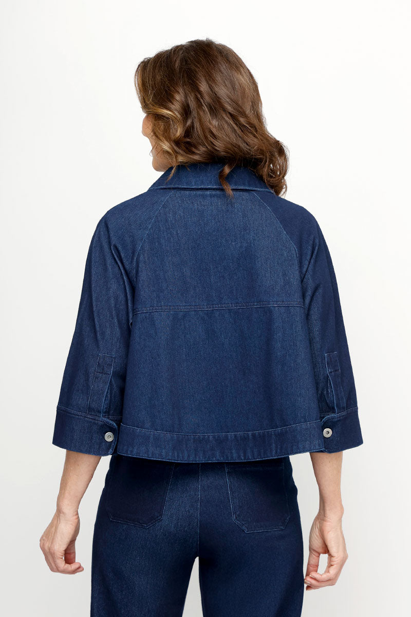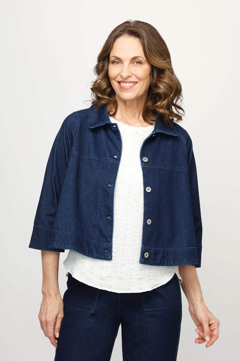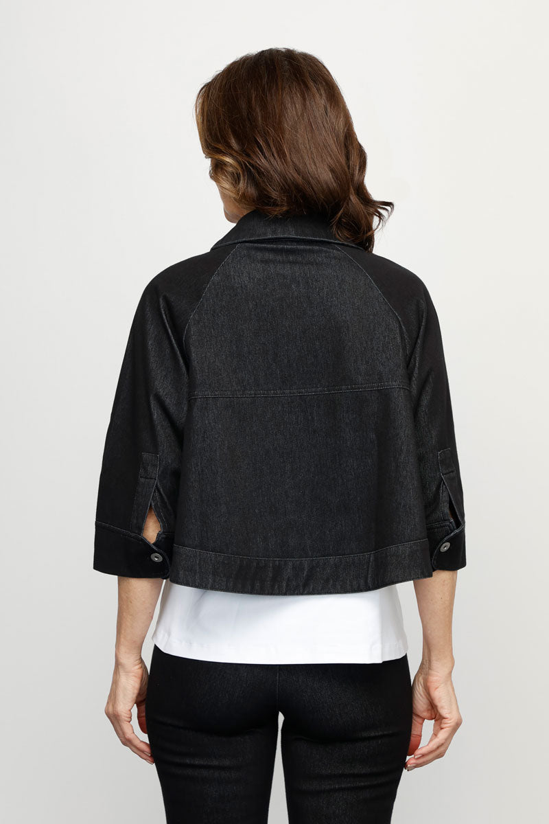 This cute cropped jacket takes denim dressing to a new level. Holland Ave has hit a home run with this versatile swing jacket. Fashioned from premium stretch denim and dyed to match all the Holland Ave denim pants, it features horizontal seam detailing, grommet buttons and a raglan 3/4 sleeve with button cuff. But don't limit yourself to wearing it with denim bottoms, it looks even better with a sleek and polished pant.