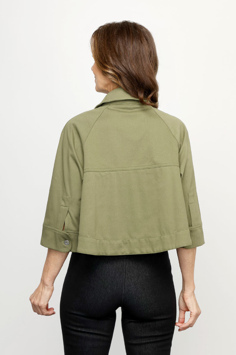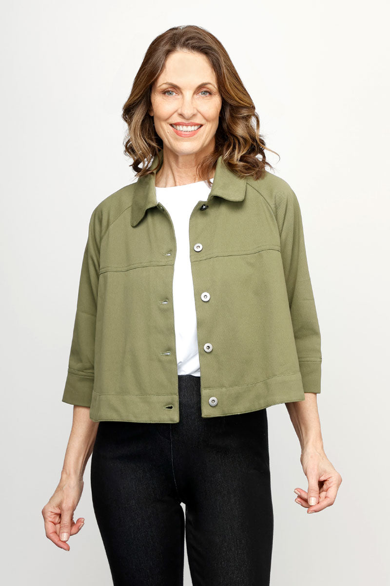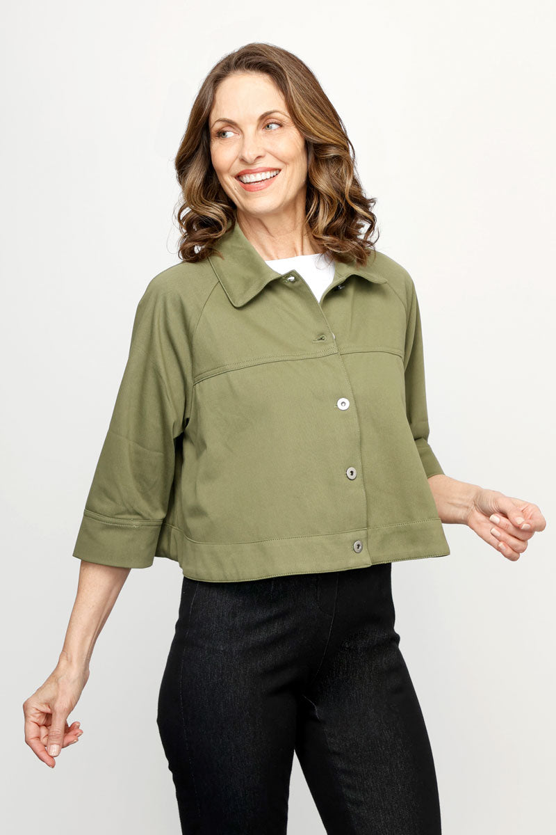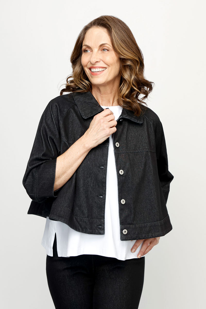 This cute cropped jacket takes denim dressing to a new level. Holland Ave has hit a home run with this versatile swing jacket. Fashioned from premium stretch denim and dyed to match all the Holland Ave denim pants, it features horizontal seam detailing, grommet buttons and a raglan 3/4 sleeve with button cuff. But don't limit yourself to wearing it with denim bottoms, it looks even better with a sleek and polished pant.