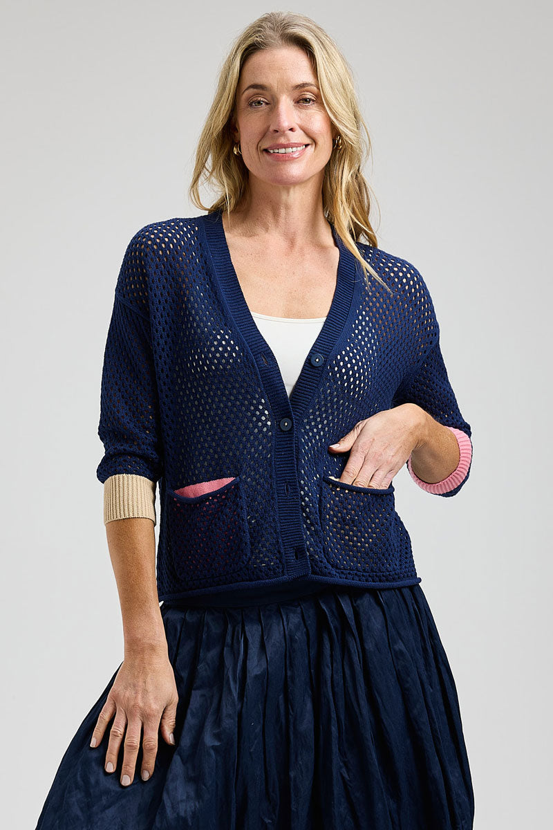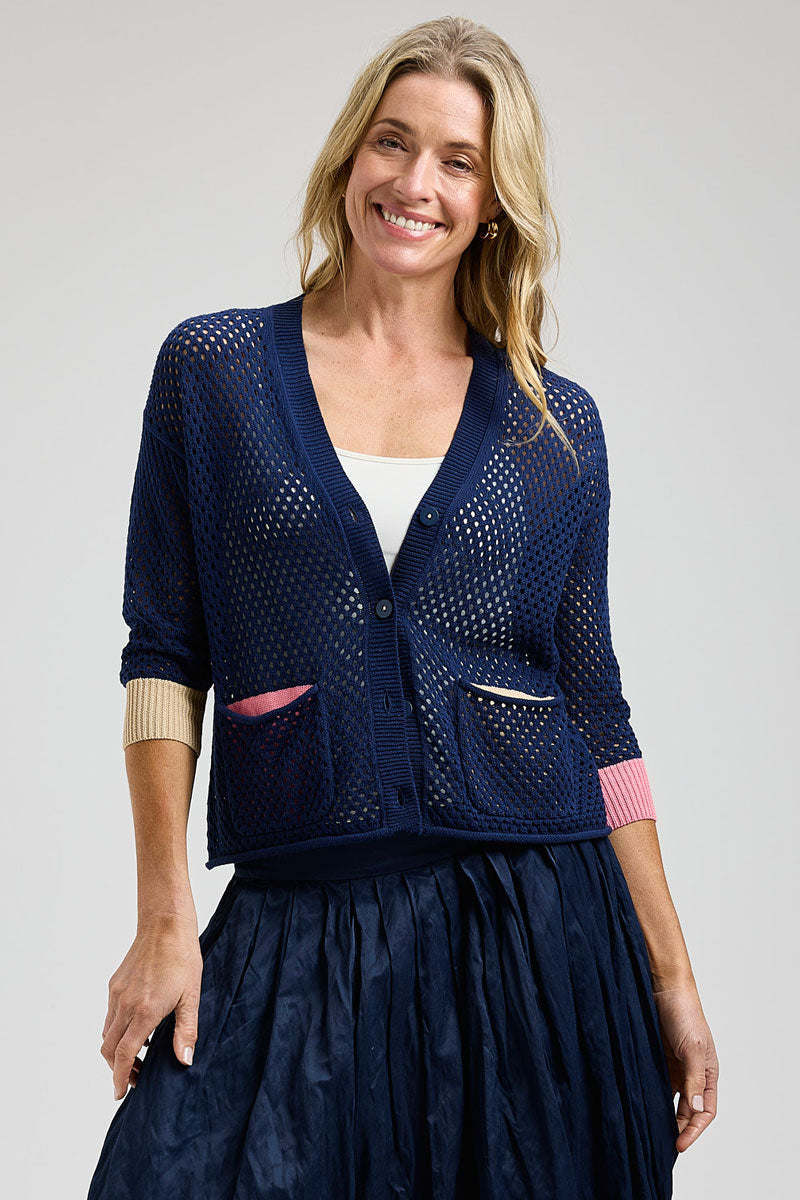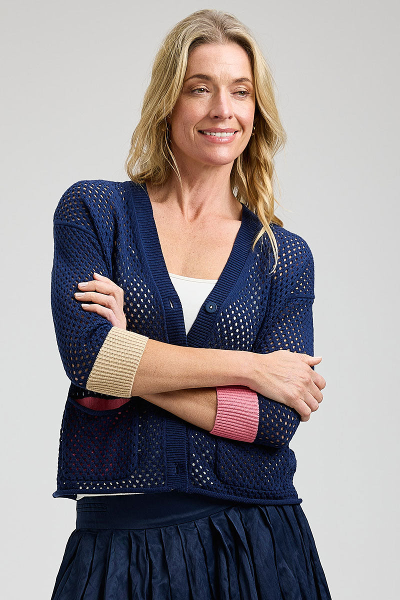 Zaket & Plover has perfected the warm weather knit. The Holey Cardigan is an open weave sweater with touches of contrast colors at the cuffs and pocket linings. We love how fun it is to mix and match colorful tanks underneath!