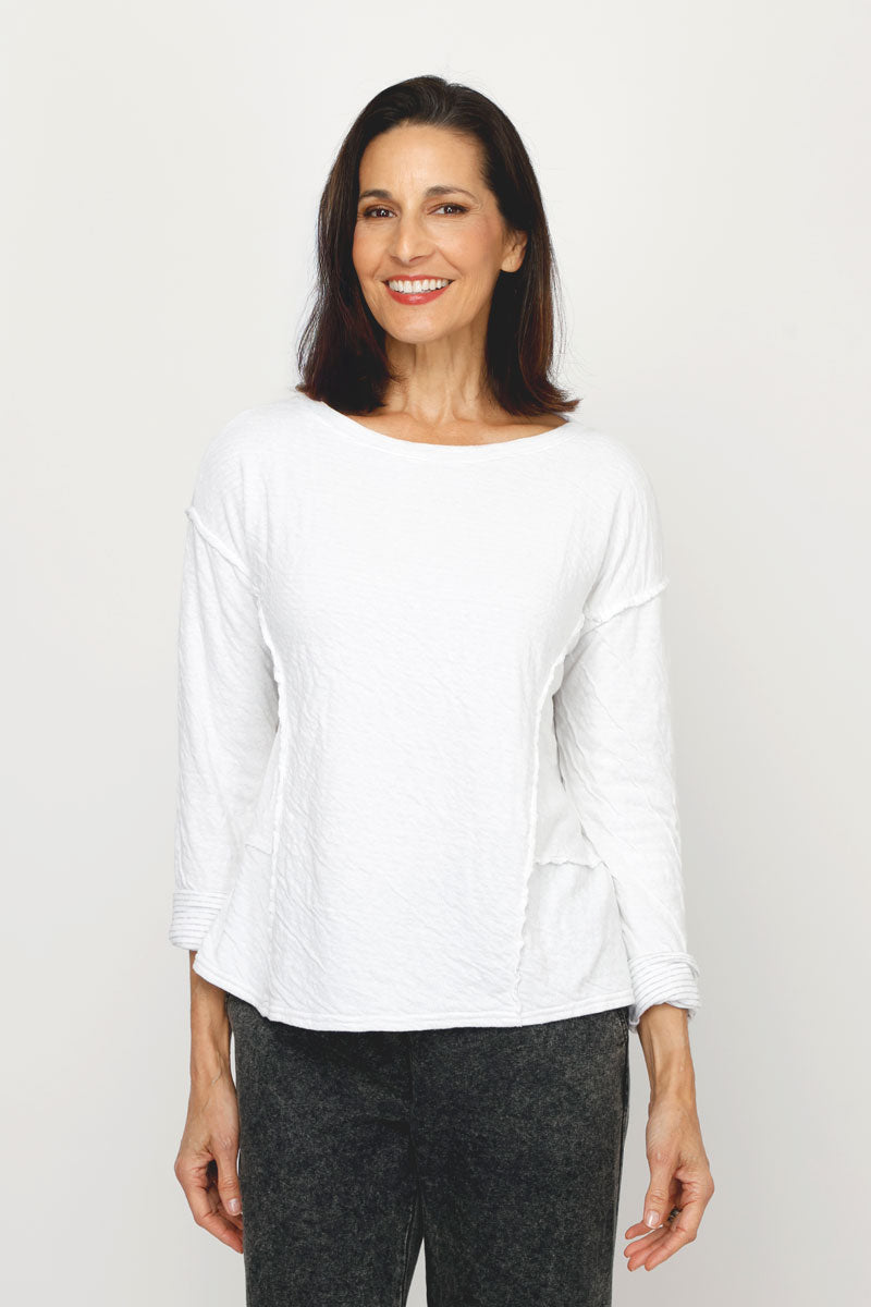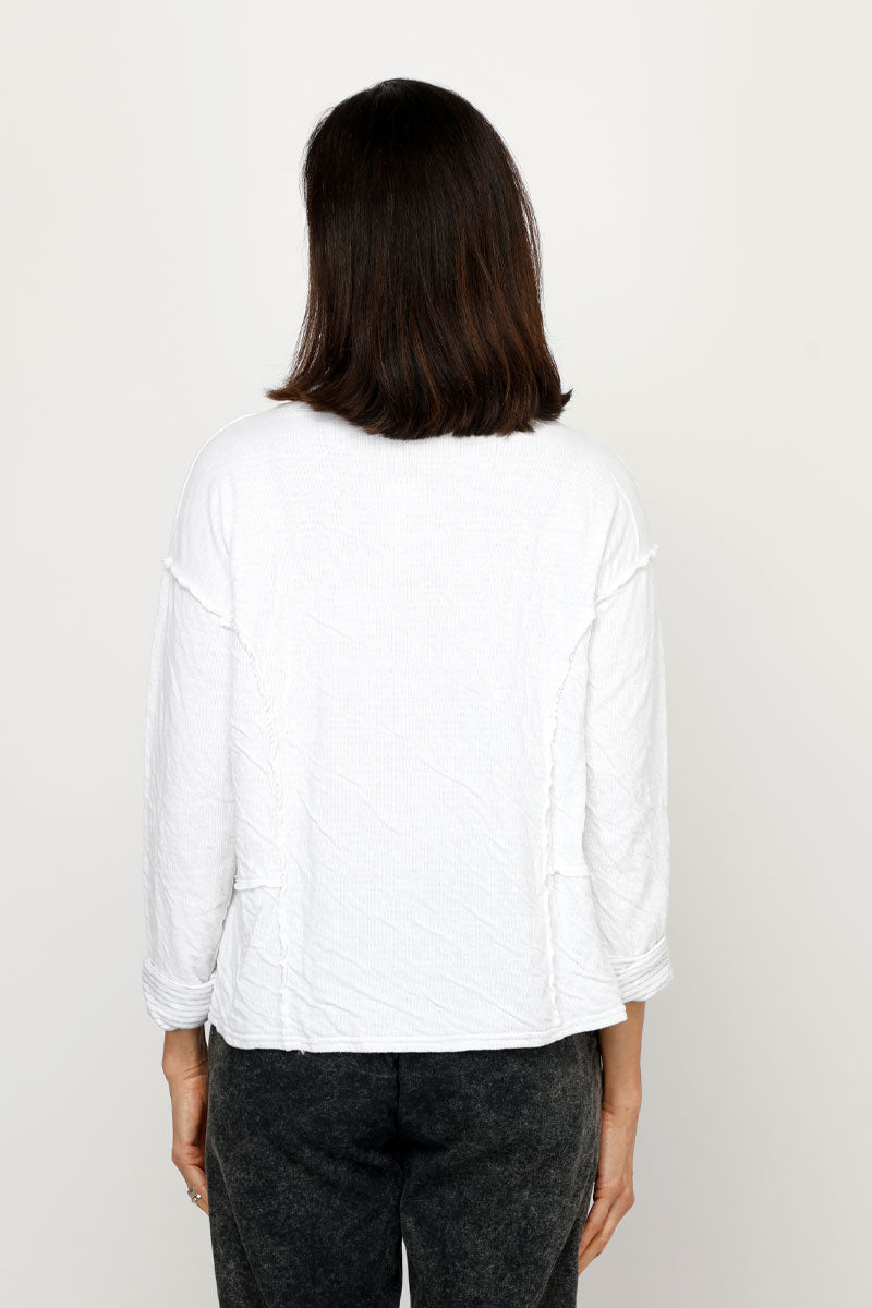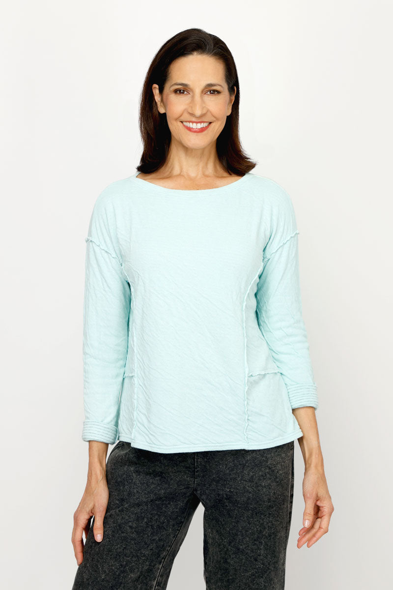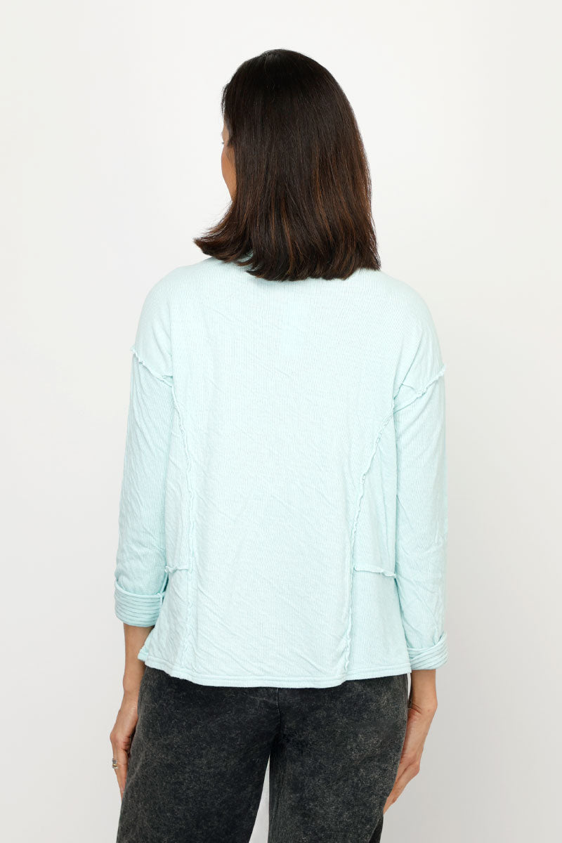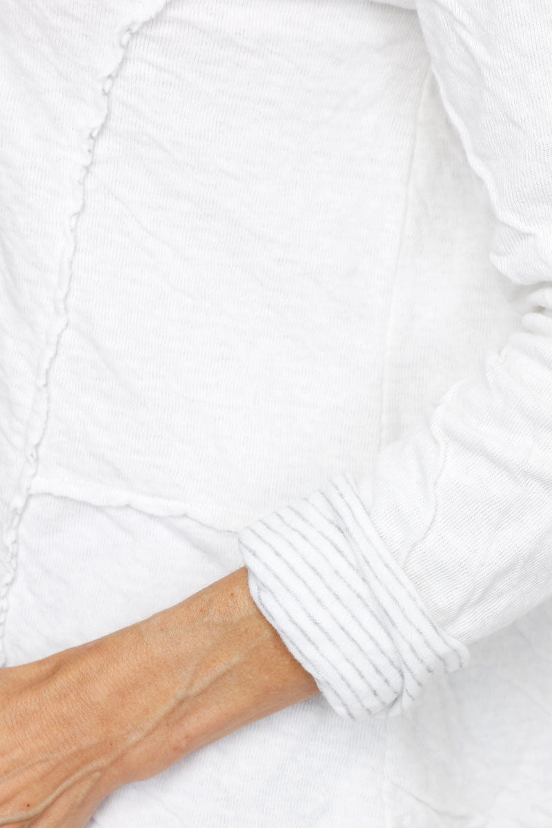 Lightweight and layered, this top plays with contrast in the best way. A solid outer layer meets a subtly striped lower layer—cuff those long sleeves to see the stripes peeking through. Raw-edge contour seams add definition while keeping the vibe relaxed and effortlessly cool.