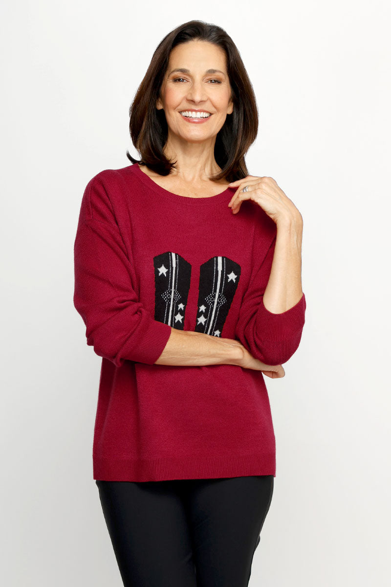 Ten Oh 8 captures this year's western trend in a comfortable and relaxed knit. The Cowboy Boots Sweater features an intarsia knit pair of boots that are boldly placed front and center. This mid-weight double knit sports rib trim and the neck hem and cuff. Pair with your favorite denim and western accessories for a complete look.