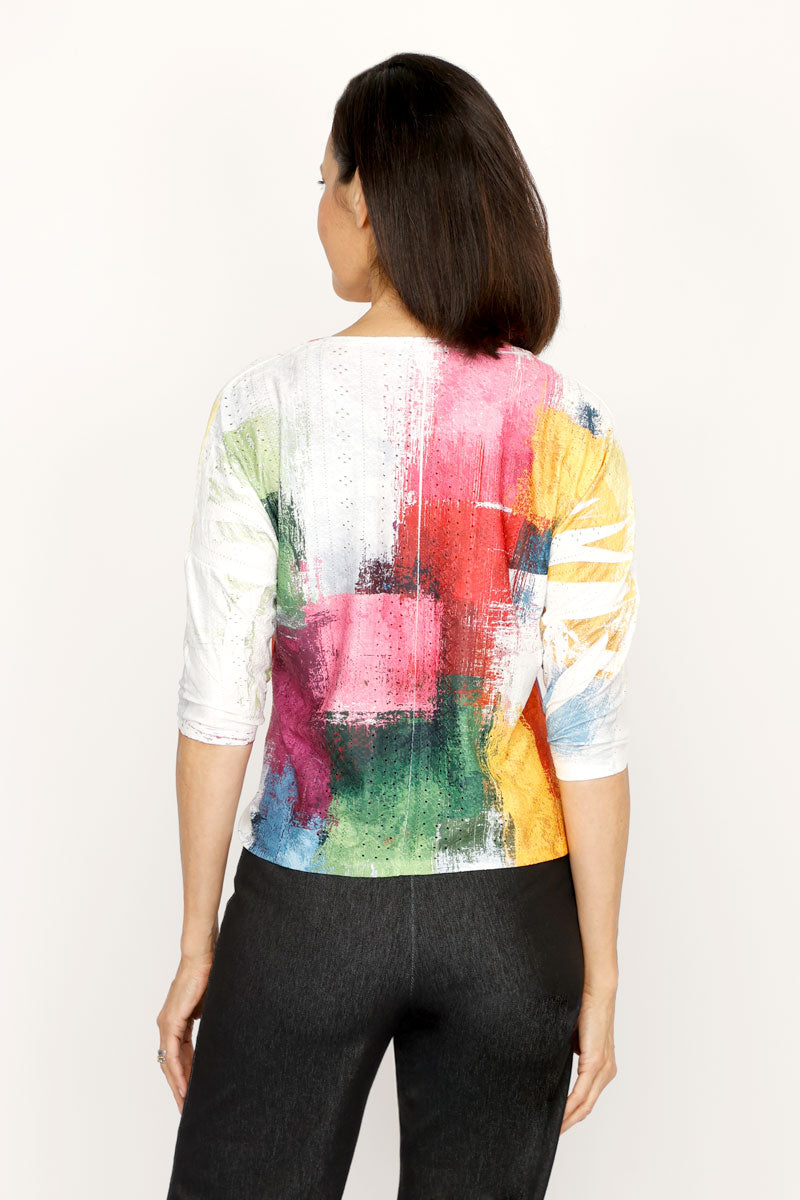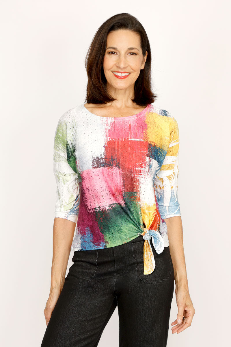 There's always room in your closet for a season-less printed essential! Crafted from breathable perforated poly and adorned with a vibrant abstract design, this asymmetric tie-front top delivers effortless style. The relaxed A-line silhouette skims your frame without clinging, making it perfect for laid-back days that still demand a fashion moment. Comfortable enough to live in, striking enough to stand out.
