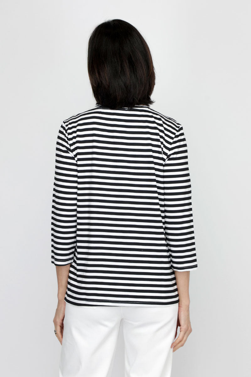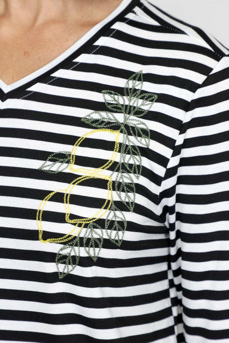 When life hands you lemons, wear them! This playful v-neck tee combines silky-soft comfort with cheeky charm. Bold black and white stripes create a timeless backdrop, while a vibrant embroidered lemon takes center stage for that perfect pop of personality. The relaxed, a-line fit keeps things breezy and effortless—because style shouldn't feel like work.