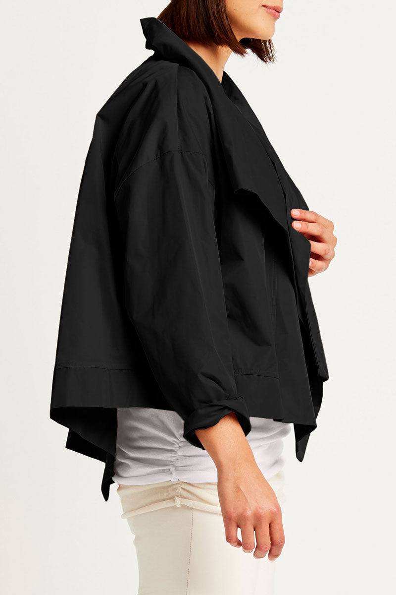 Edgy and fun, the Planet Nylon Asymmetrical Jacket is lustrous and soft - a definite statement piece!  Short and cropped with roll-back sleeves, it's a a fun silhouette in a durable fabric!