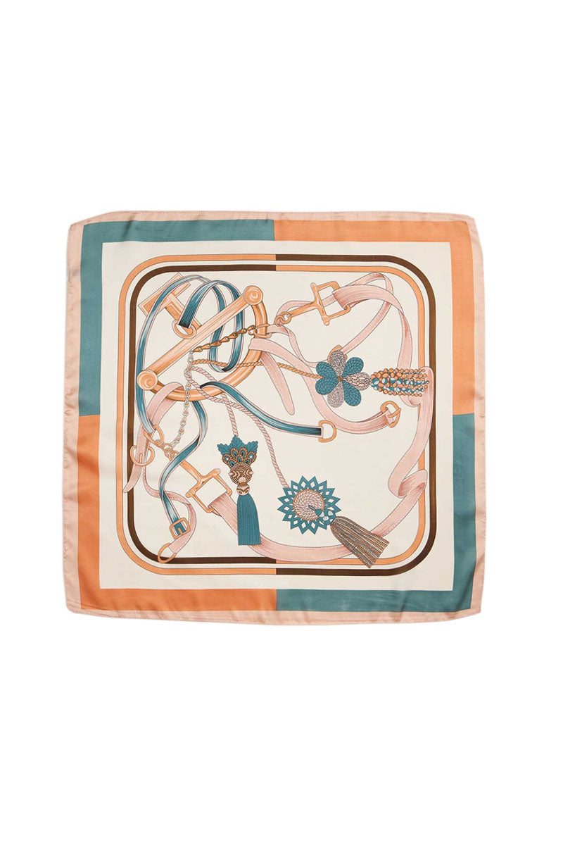This square scarf features an elegant equestrian-inspired print with belts, tassels, and floral motifs in soft peach, teal, and ivory tones. Its refined design and silky finish make it a timeless accessory that pairs beautifully with both casual and polished looks.